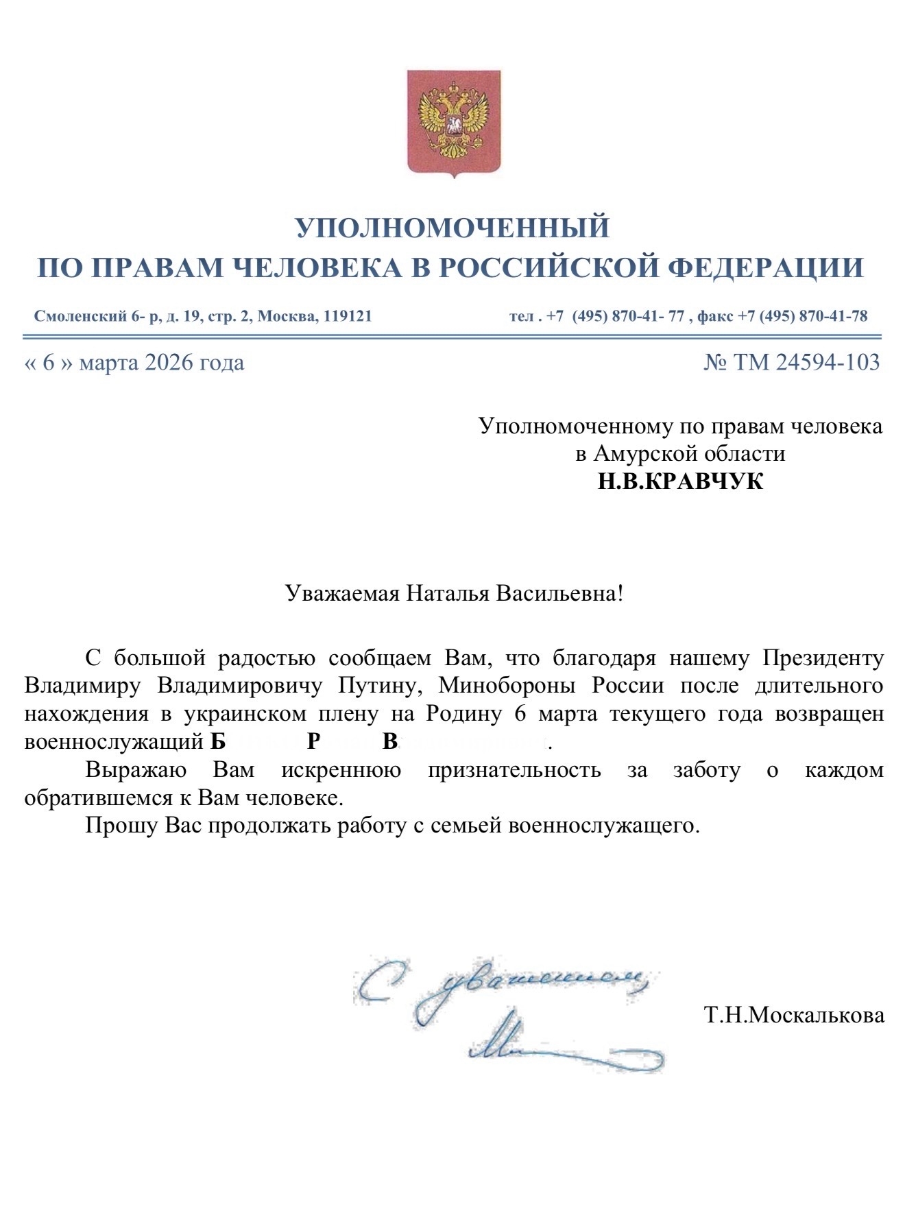 🙏Выражаю огромную благодарность Татьяне Москальковой, Министерству обороны и всем причастным к этому сложнейшему процессу. Каждое возвращение — это не просто пункт в списках, а судьба человека, это надежда, которая возвращается в каждую семью.