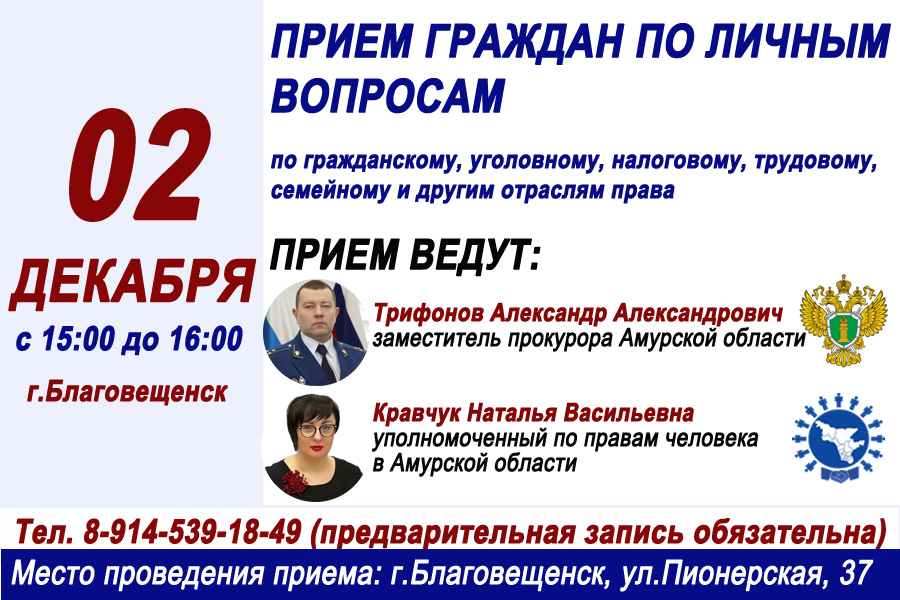 02 декабря 2025 года с 15.00 до 16.00 — совместный с прокуратурой области прием граждан