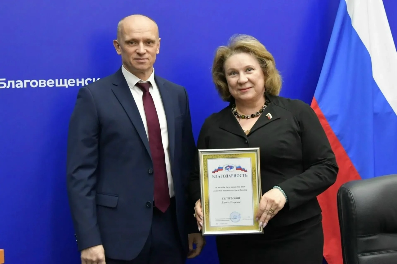 Так в рамках ежегодного отчета главы Благовещенского муниципального округа состоялась торжественная церемония, на которой по просьбе Уполномоченного по правам человека в Российской Федерации была вручена благодарность «За вклад в дело защиты прав и свобод человека и гражданина» общественному деятелю Евгении Пушиной.