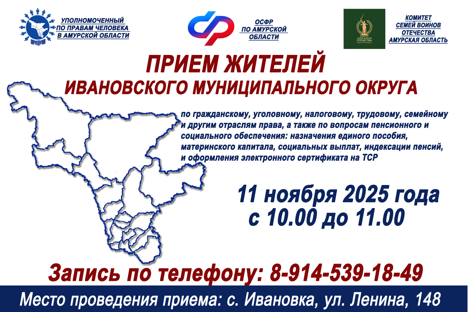 11 ноября 2025 года с 10.00 до 11.00 уполномоченный по правам человека в Амурской области Н.В.Кравчук, Управляющий ОСФР по Амурской области Е.В.Гончарова и руководитель Автономной некоммерческой организации «Комитет семей воинов Отечества» Амурской области Е.И.Евглевская проведут личный прием для жителей Ивановского муниципального округа.